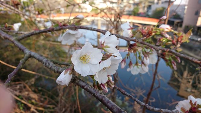 この桜は今朝、川沿いを見に行くと咲き始めていました。