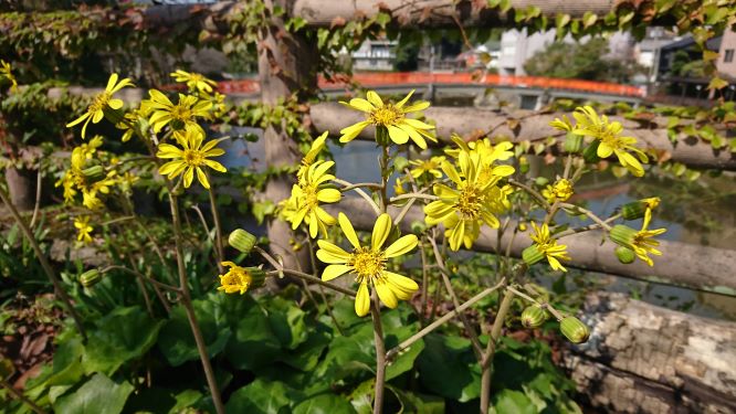 和楽園玄関先の、川沿いに「 つわぶきの花 」が咲いていました。