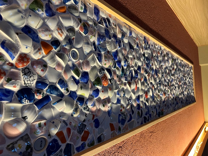 三日月をかわいらしい暖かみを表現したカラートーンを中心に、嬉野の肥前吉田焼の窯元「副正製陶所」「新日本製陶」の陶片で装飾をしております。月齢の中でかわいいと表現される三日月。そのかわいいを「嬉野ならでは」の空間で表現。お気に入りの陶片も探すのも楽しい1部屋になっています。