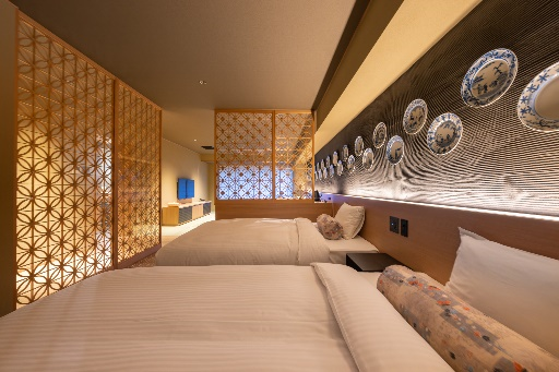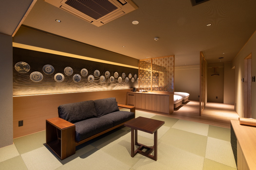 満月は美しい月、満ち足りた月、力の象徴とされる月になります。「新月」「三日月」「弓張月」の3部屋は、月も欠けているため陶片を使用しておりましたが、「満月」は満ち足りている月。そのため、肥前吉田焼のお皿を壁装飾にしております。嬉野の肥前吉田焼の窯元「辻与製陶所」の手書き皿を31枚ずらっと並べた壁面はまさに圧巻。まさにギャラリー。どんな方でも過ごしやすい空間をイメージした和洋室となっております。