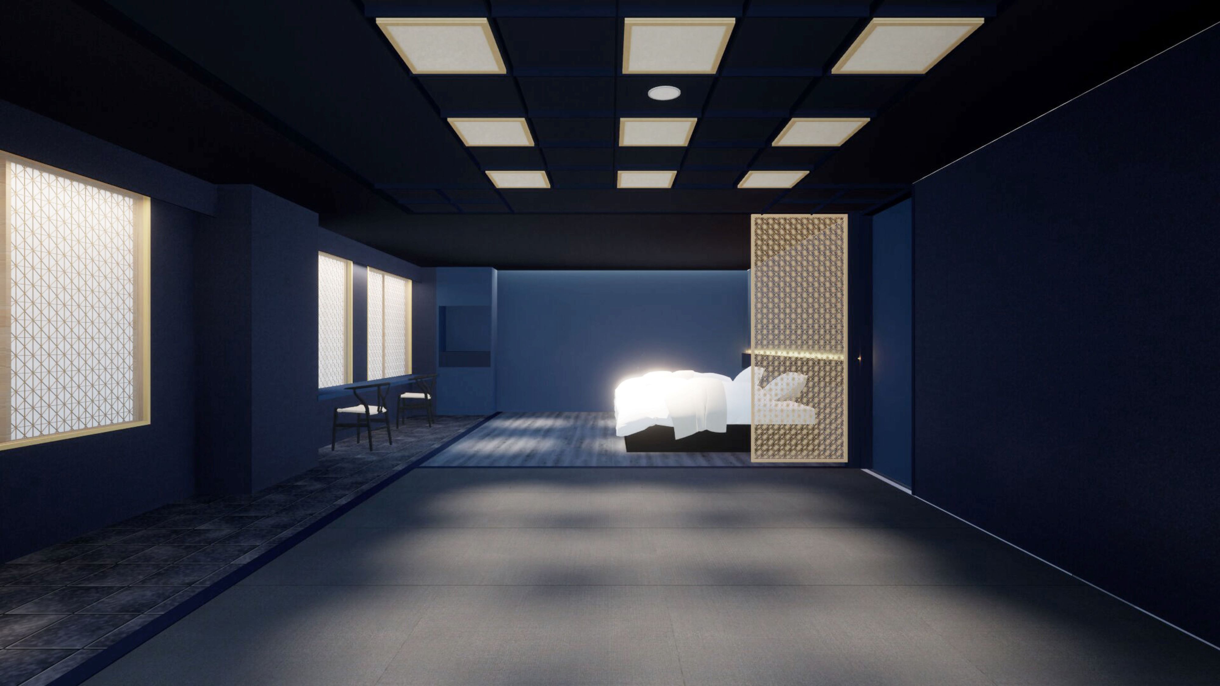 ARIAKE家具にインスパイアされ、客室全体を「紺」の濃淡で表現しています。様々な紺色、紺の表情を楽します。